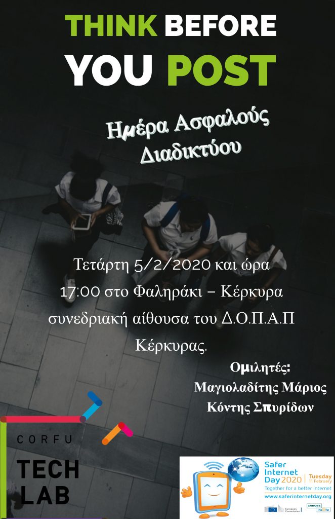 Η Δημόσια Κεντρική Ιστορική Βιβλιοθήκη Κέρκυρας, στο πλαίσιο λειτουργίας του Corfu Tech Lab, και με αφορμή την Παγκόσμια Ημέρα Ασφαλούς Δικτύου, πραγματοποιεί επιμορφωτική συνάντηση με θέμα: Think Before You Post την Τετάρτη 05/02/2020 και ώρα 17:00.