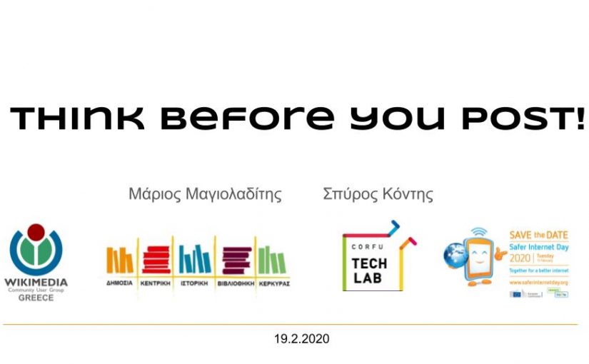 Η Δημόσια Κεντρική Ιστορική Βιβλιοθήκη Κέρκυρας, στο πλαίσιο λειτουργίας του Corfu Tech Lab, και με αφορμή την Παγκόσμια Ημέρα Ασφαλούς Δικτύου, πραγματοποιεί επιμορφωτική δράση στο Σχολείο Δεύτερης Ευκαιρίας Κέρκυρας με θέμα: Think Before You Post την Τετάρτη 19/02/2020 και ώρα 18:00.